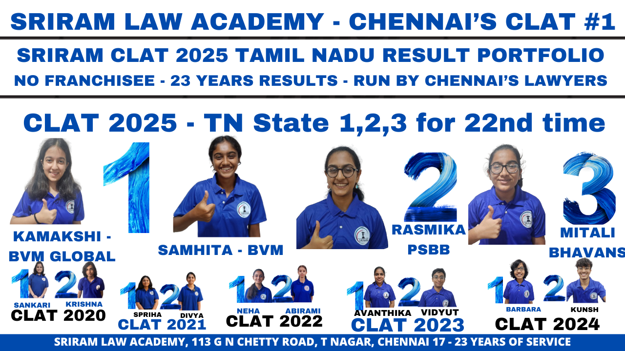 2025 - Kamakshi Tandon, Samhita Anand, Rasmika and Mitali emerged with Ranks 1, 2, 3 & 4 from the State of TN, and joined NLSIU, Bangalore. Hundreds of students from Sriram got selected in India's National Law Universities through the 2025 examination season.